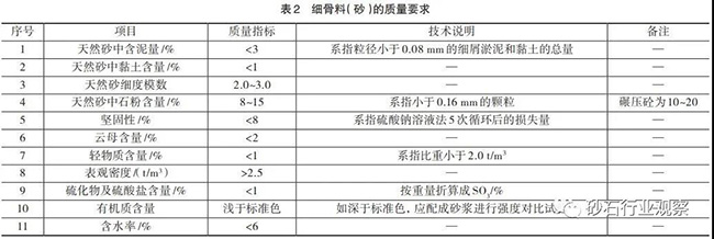 砂石骨料一般分為粗骨料和細骨料兩種,粒徑大于5mm的為粗骨料,小于5mm的為細骨料。粗骨料按粒徑80~150mm為特大石,40~80mm為大石,20~40mm為中石,5~20mm為細石;細骨料分為粗砂、中砂和細砂。骨料質(zhì)量管理主要控制粗骨料的遜徑和細骨料的石粉含量及細度模數(shù),混凝土用砂石骨料加工,質(zhì)量要求詳見下表。