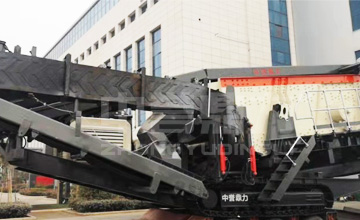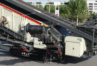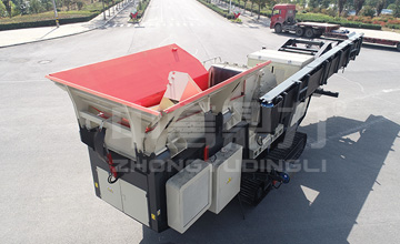 履帶式移動篩分站一般搭配履帶破碎移動站組成移動式破碎篩分一體機,中間以皮帶機相連接,給料系統由料倉和振動給料機組成,下方的預篩分下料斗和出土皮帶機,可以將原料中的土先分離出來再進行破碎。