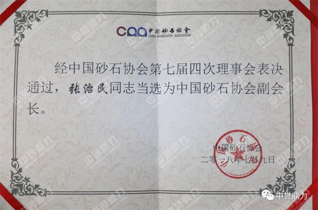 經中砂石協會第七屆四次理事會表決通過,中譽鼎力智能裝備有限公司董事長張治民當選中砂石協會副會長!
