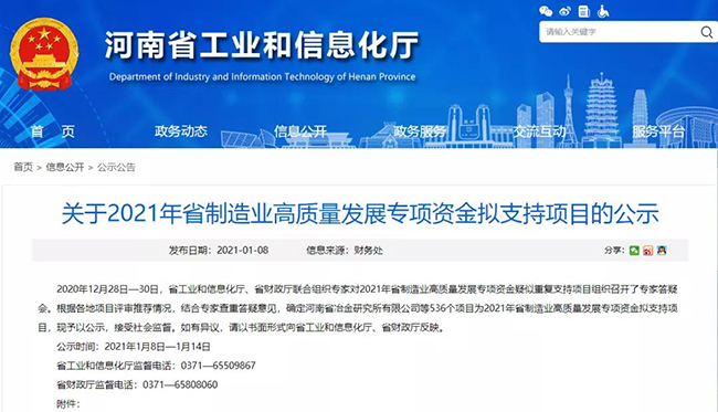 2020年12月28日—30日,河南省工業和信息化廳、省財政廳聯合組織對2021年省制造業高質量發展專項資金疑似重復支持項目組織召開了答疑會,536個項目為2021年省制造業高質量發展專項資金擬支持項目。