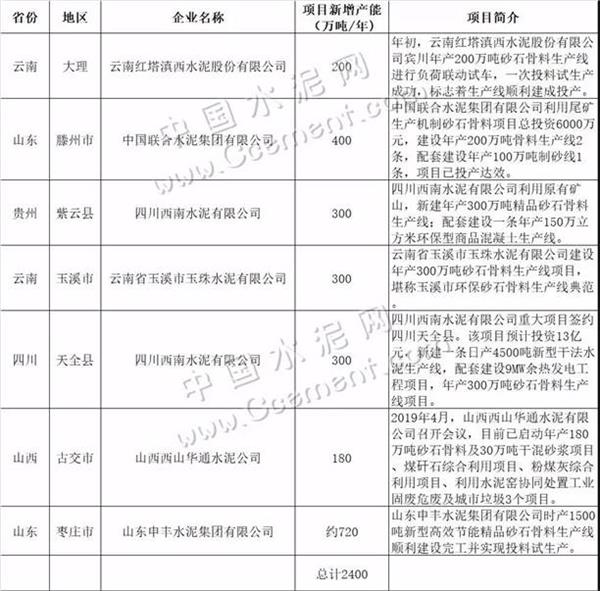 以下表格列舉了部分水泥企業(yè)2019年投產(chǎn)的砂石骨料生產(chǎn)線,年產(chǎn)骨料約2400萬噸。