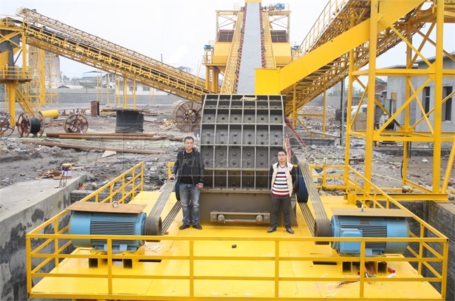 一、大塊石料經(jīng)ZGC2038振動給料機(jī)均勻的送到PCZ1615重型錘式反擊破碎機(jī)進(jìn)行粗碎
