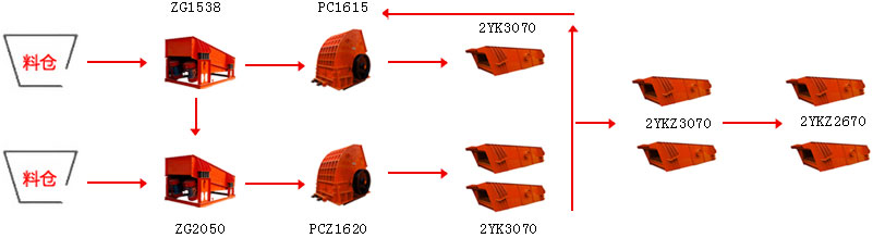 針對石灰石質脆、硬度低的物料特性,石灰石破碎生產線上適合采用一次成型的錘式破碎機設備,設備投資低,破碎比大,生產效率高。從山上爆破下來的大塊石灰石,經錘破破碎后,由振動篩篩分出滿足建筑要求的多種規格石料。